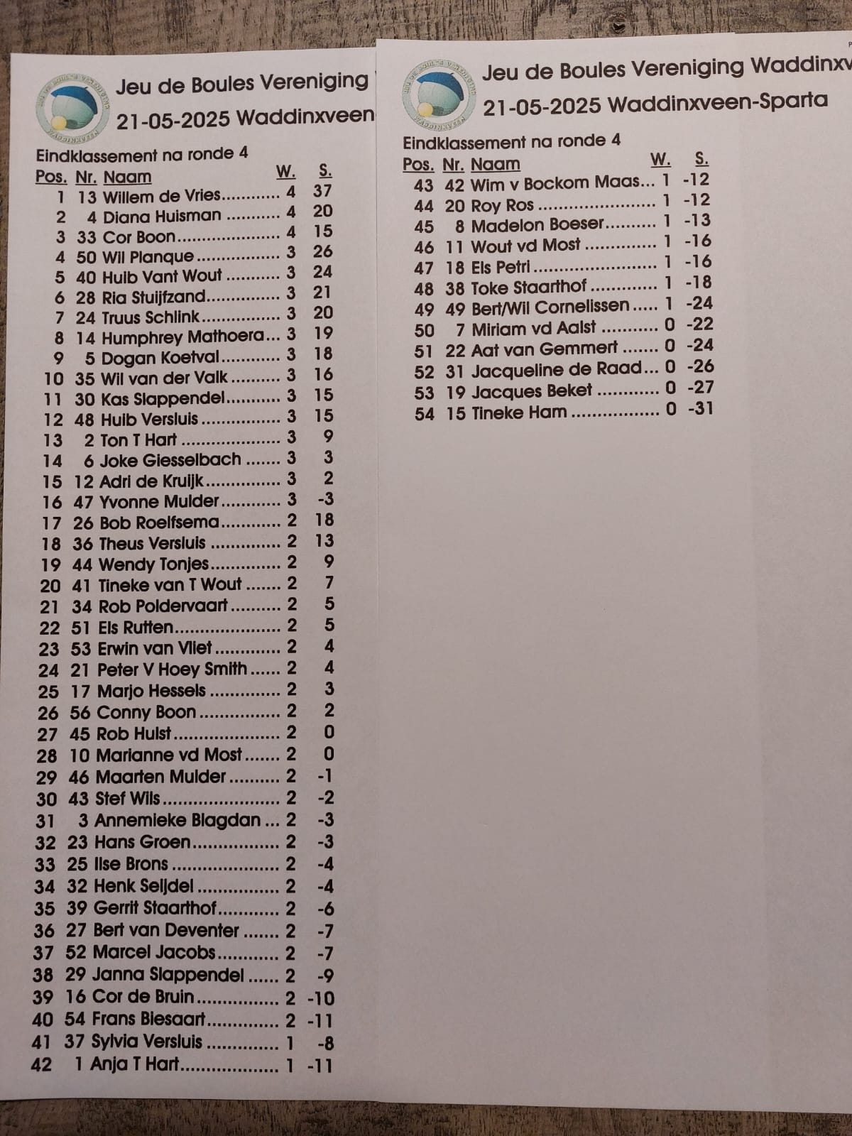 Vandaag hadden we de tweekamp tussen Sparta en JdB Waddinxveen. Ditmaal waren wij de gastheer. De eerste Spartanen werden al kort na 9:00 gesignaleerd. De inschrijving verliep vlot en na de opening van de dag door Wout konden de eerste partijen worden afgewerkt. Het weer werkte mee: soms wat zon en soms een frisse wind, maar al met al mooi weer om petanque te spelen. Na twee partijen werd er een lunch geserveerd en konden we kennis maken een nieuwe catering. Ons kersvers (bestuurs)lid Jan Been had deze georganiseerd tot volle tevredenheid van de aanwezigen: een soepje, snackje, frietje én een mini brownie. Applaus en hulde voor Jan. Daarna kon het middagprogramma worden afgewerkt. Het resultaat van deze dag: de beste van Sparta werd Willem de Vries, aan de kant van Waddinxveen werd dit Cor Boon. De Co van de Berg trofee ging naar Waddinxveen, wij hadden uiteindelijk de meeste punten. Belangrijker nog: het werd een gezellige speeldag waarin de goede relatie tussen Sparta en ons maar eens weer werd bekrachtigd. De volgende keer reizen we af naar Capelle, want dan zijn wij te gast bij ‘de gezelligste jeu de boules club van Nederland’.